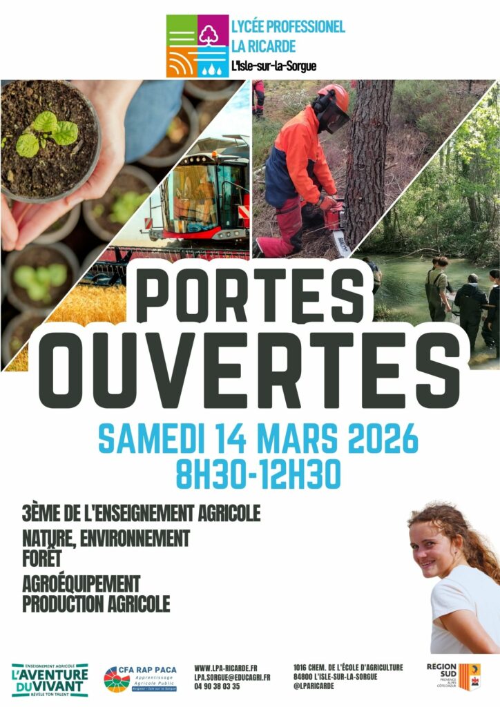 La journée Portes Ouvertes annuelle du lycée La Ricarde est programmée le 14 mars 2026 de 8h30 à 12h30.